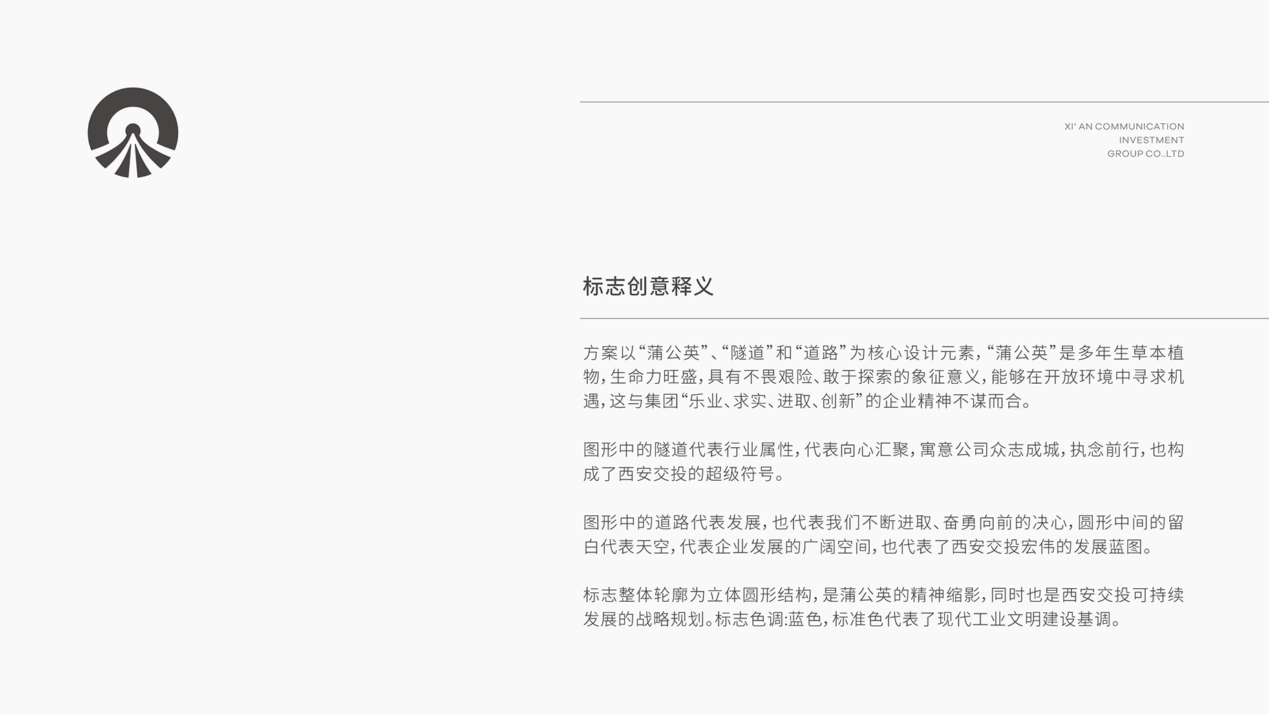 标志整体轮廓为立体圆形结构,是蒲公英的精神缩影,同时也是西安交投可持续发展的战略规划。标志色调:蓝色,标准色代表了现代工业文明建设基调。